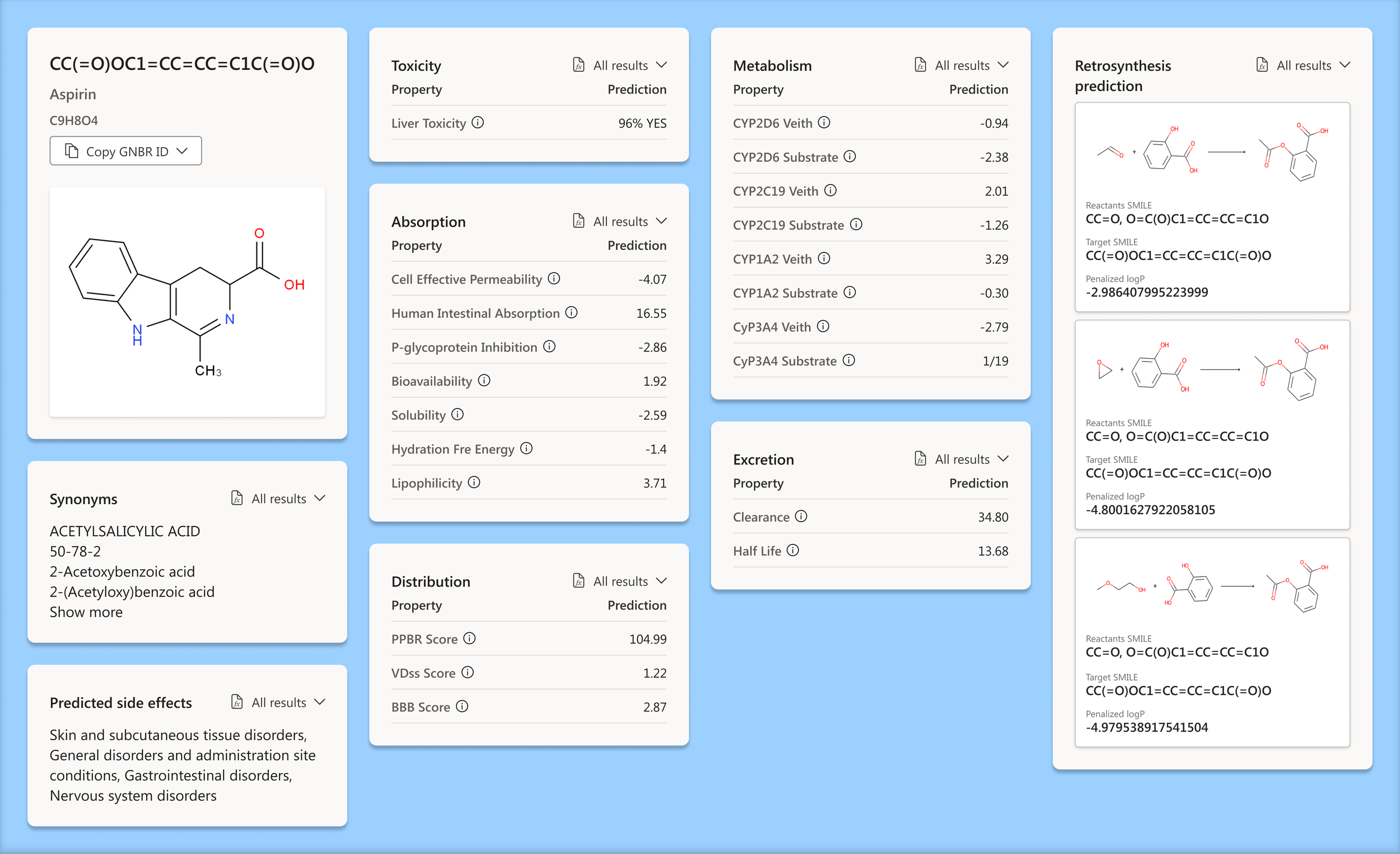 This section groups all the information we could pull for a specific molecule. All the complicated data points that scientists search for in one spot in a framework that gives the user what they need to know.